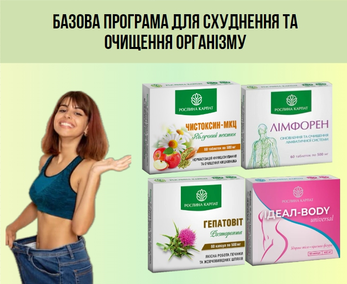 Froomo, маркетплейс професійної косметики та товарів для здоров'я\\Базова програма схуднення Рослина Карпат 1 курс, Лімфорен, Ідеал боді універсал, Чистокси, Гепатовіт 240шт
