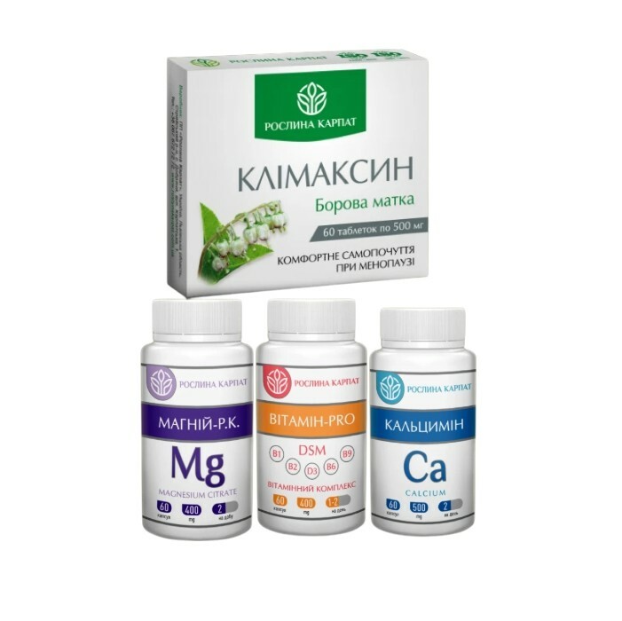 Froomo, маркетплейс професійної косметики та товарів для здоров'я\\Комплексна програма при климаксі від Рослина Карпат Клімаксин, Кальцимін, Вітамін PRO, Магній 4 препарати