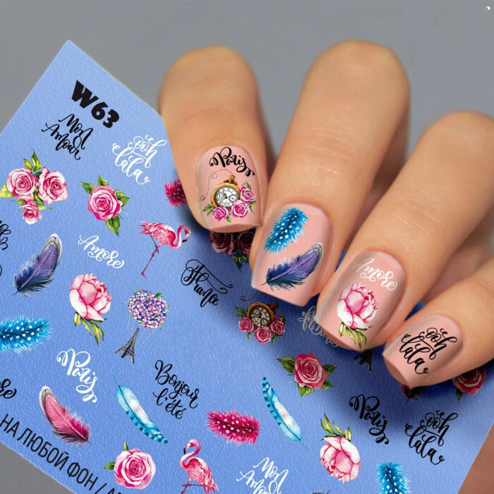Наклейки на нігті Париж, Рожевий Фламінго, Троянди, Написи - Слайдер-дизайн Пір'я Годинник W63